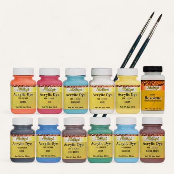 Each pack contains one 2 ounce bottle of our famous Acrylic Dye in the following colors: Black, Blue, Yellow, Red, Light Blue, White, Medium Brown, Dark Brown, Green, Turquoise and Orange. Also contains one 2 ounce bottle of Fiebing’s Resolene acrylic top finish plus two artist brushes.