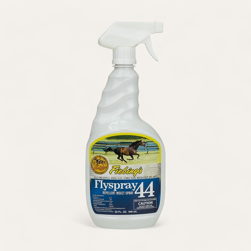 Specifically designed for use on horses, Flyspray 44 is Fiebing’s premium fly control product. This unique blend of four insecticides provides a long lasting protective barrier against pests. One application provides days worth of protection from mosquitos, house flies, stable flies, horse flies, horn flies and gnats. This product also contains lanolin to give the horse’s coat a high sheen after brushing. Contains pyrethrins, piperonyl butoxide and citronella oil.