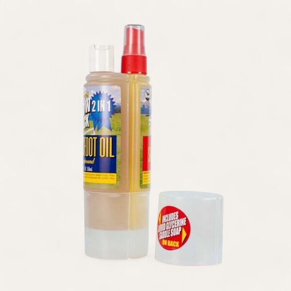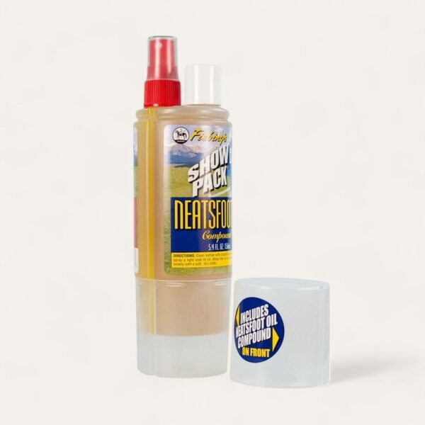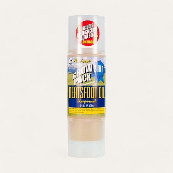 Place this unique package in your tack box and be prepared with Fiebing’s Liquid Glycerine Saddle Soap (5.4 FL OZ) and Fiebing’s Neatsfoot Oil Compound (5.4 FL OZ). Everything you need for a show ring saddle sure to impress the judges. Fiebing’s Leather Care Show Pack also includes a foam sponge.