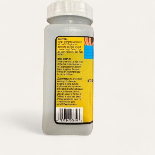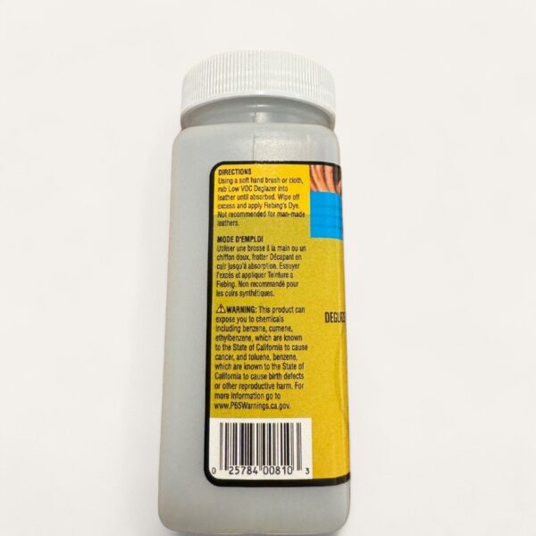 Fiebing’s Low VOC Deglazer is a solvent-based product used to remove finishes from leather surfaces. It’s typically used as a preparatory step before dyeing or refinishing leather. Low VOC Deglazer is available to ship to California.