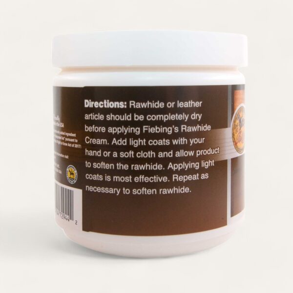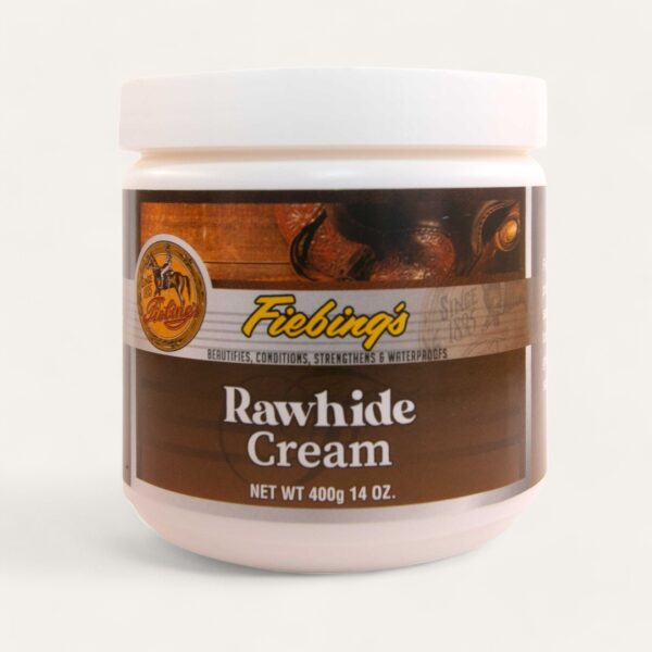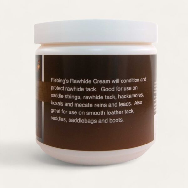Fiebing’s Rawhide Cream will condition and protect rawhide tack. Good for use on saddle strings, rawhide tack, hackamores, bosals and mecate reins and leads. Also great for use on smooth leather tack, saddles, saddlebags and boots.